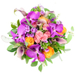 Celebrate with our Majestic Bloom Collection, a breathtaking arrangement of orange, pink, and purple flowers, enhanced by abundant greenery for a luxurious appearance.