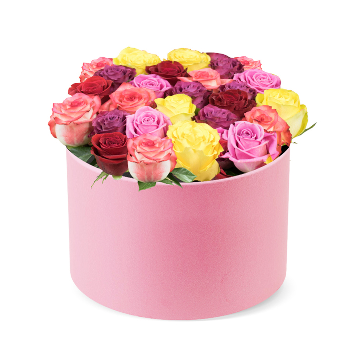 Brighten someone's day with our unique flower arrangement featuring a harmonious blend of purple, red, yellow, and pink roses. Each flower is carefully chosen to ensure maximum freshness and longevity.